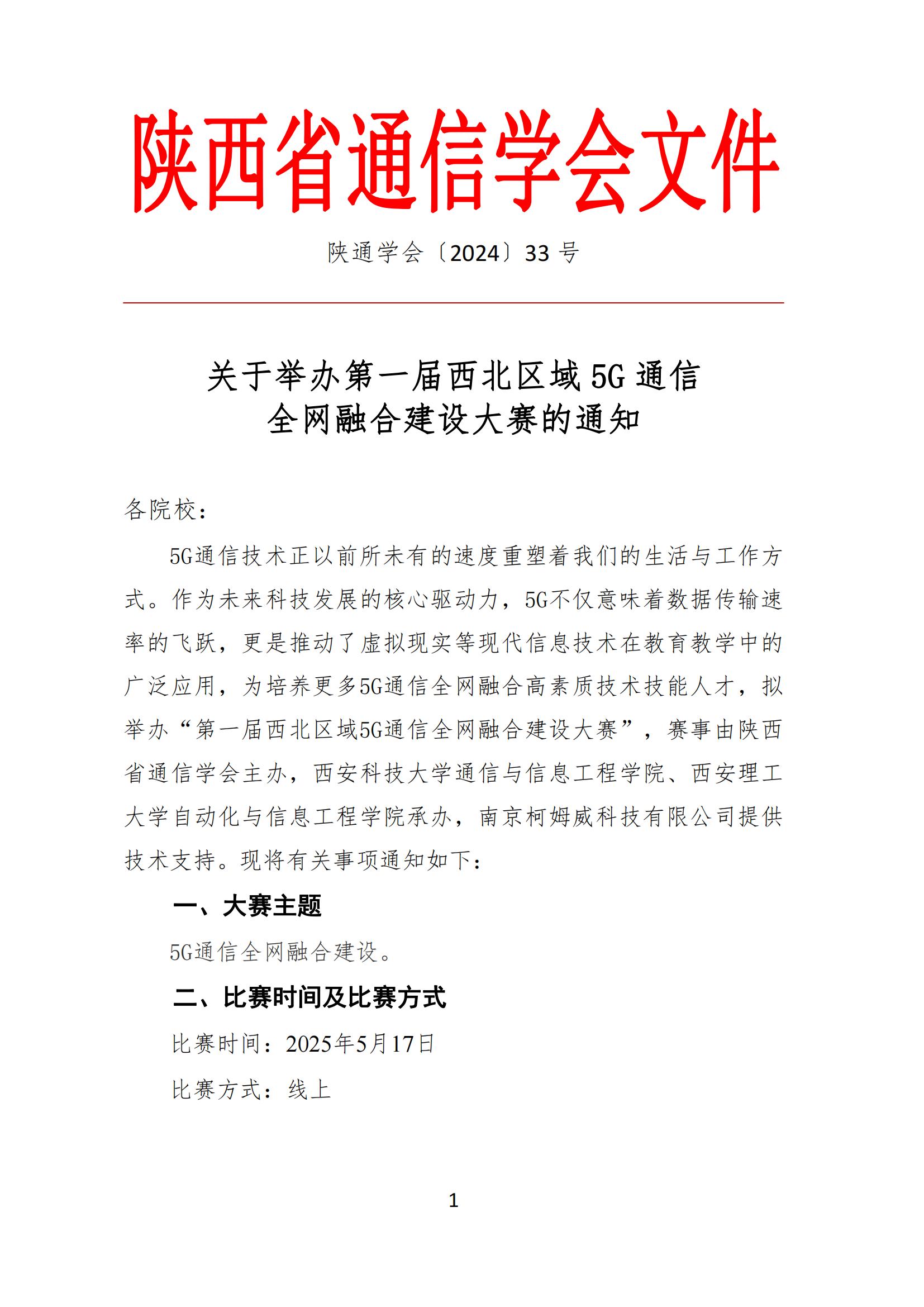 5G通信技术正以前所未有的速度重塑着我们的生活与工作方式。作为未来科技发展的核心驱动力,5G不仅意味着数据传输速率的飞跃,更是推动了虚拟现实等现代信息技术在教育教学中的广泛应用,为培养更多5G通信全网融合高素质技术技能人才,拟举办“ 第一届西北区域5G通信全网融合建设大赛 ”,赛事由陕西省通信学会主办,西安科技大学通信与信息工程学院、西安理工大学自动化与信息工程学院承办,南京柯姆威科技有限公司提供技术支持。现将有关事项通知如下: